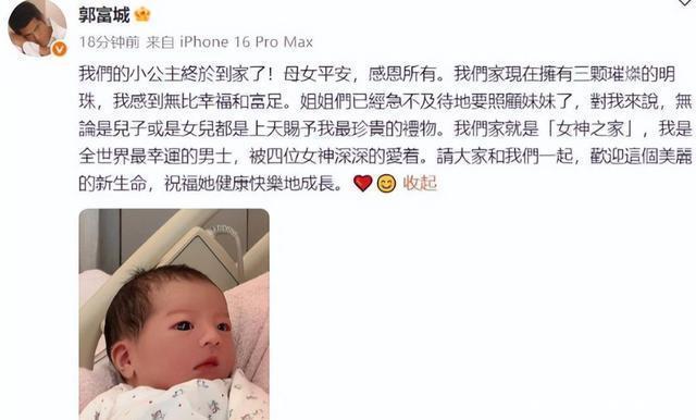 结语 虽然外界对郭富城三胎得女这件事存在争议。 但对于他们一家来说,这就是一件喜事。